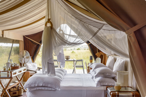 | Mara River Camp’s location on the northern banks of the Mara River provides excellent opportunities to view the annual wildebeest migration crossings. As the Lamai triangle forms a uniquely fertile part of the Mara eco- system, there are year-round concentrations of resident plains game, big cats, elephant, crocodile, and hippo. Bohemian chic designs set the tone, with natural materials blending in with Maasai primary colors, along with elegant art pieces made by young African craftsmen. This relaxing, cool design encourages Guests to embrace the outdoors and connect with nature. |