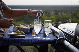 | There is nothing quite as wonderful as that first sip from a freshly made cocktail or an ice-cold soft drink with a splash of lime. Moreover, those who have experienced it from the edge of a waterhole or some other amazing view in the gathering dusk will tell you that the most delicious drink of all is the one served off the back of a game vehicle. An awe-inspiring sunset is one of the wilderness events guaranteed to take place! |